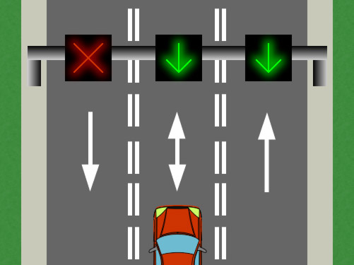 El vehículo rojo circula por el carril reversible que está abierto. ¿Puede atravesar la línea doble discontinua de su izquierda para adelantar?