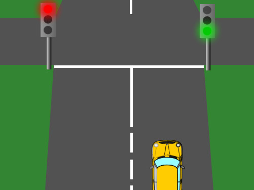El semáforo de la derecha está verde y el de la izquierda está rojo. ¿Qué debe hacer para continuar de frente?
