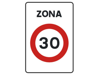 Indica que la velocidad máxima de los vehículos está fijada en 30 km/h y la prioridad entre vehículos y peatones se regirá por la norma general.